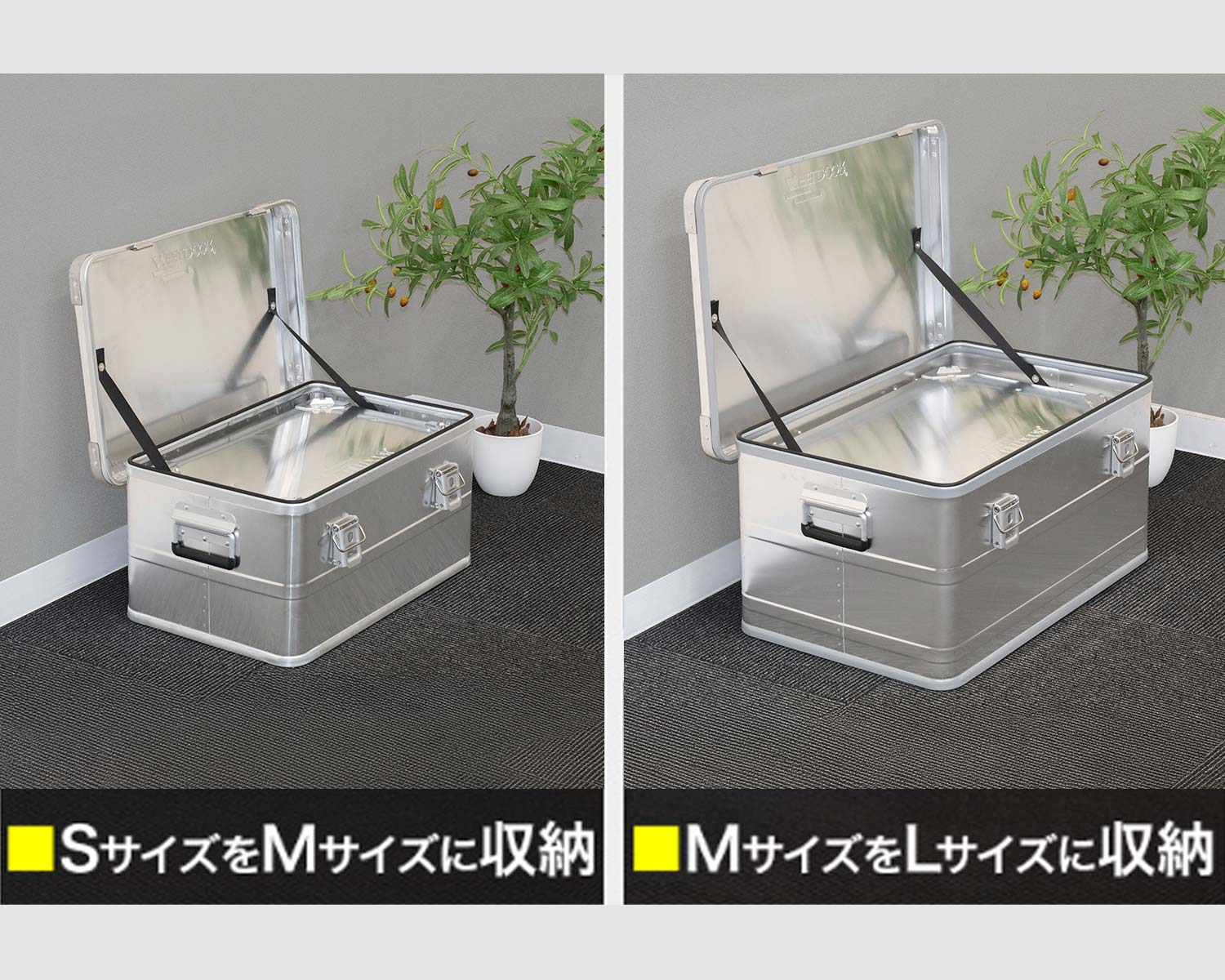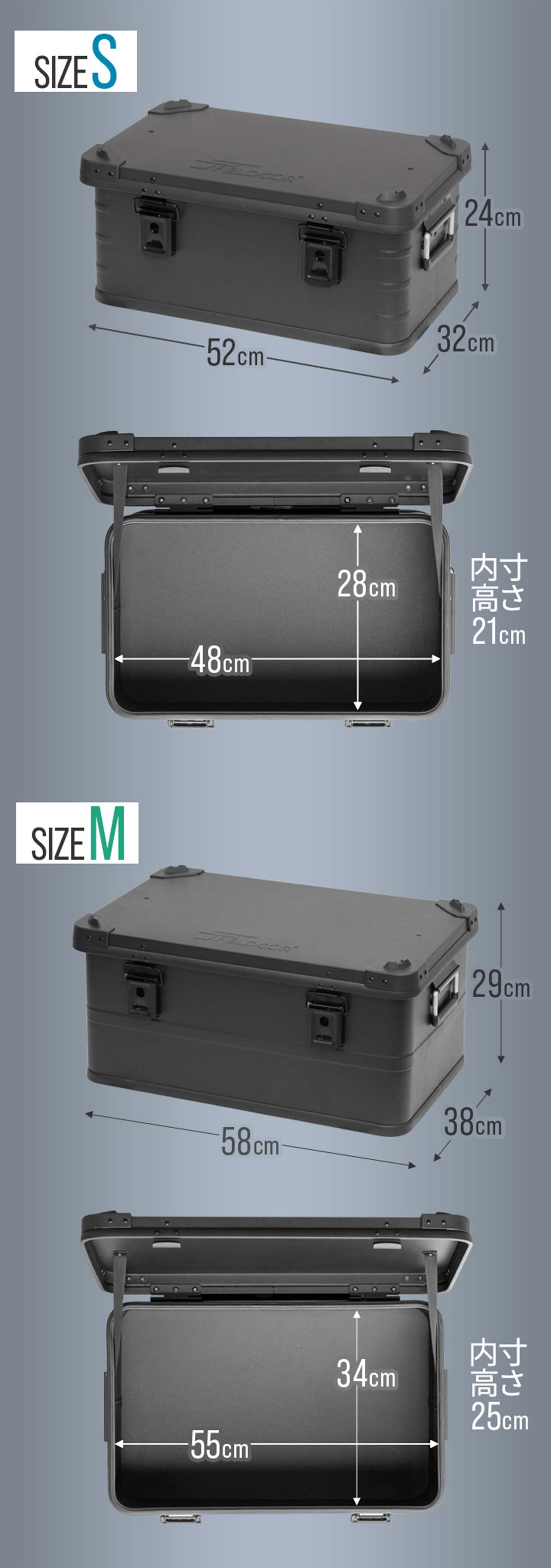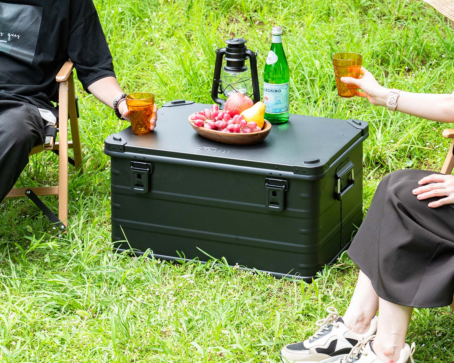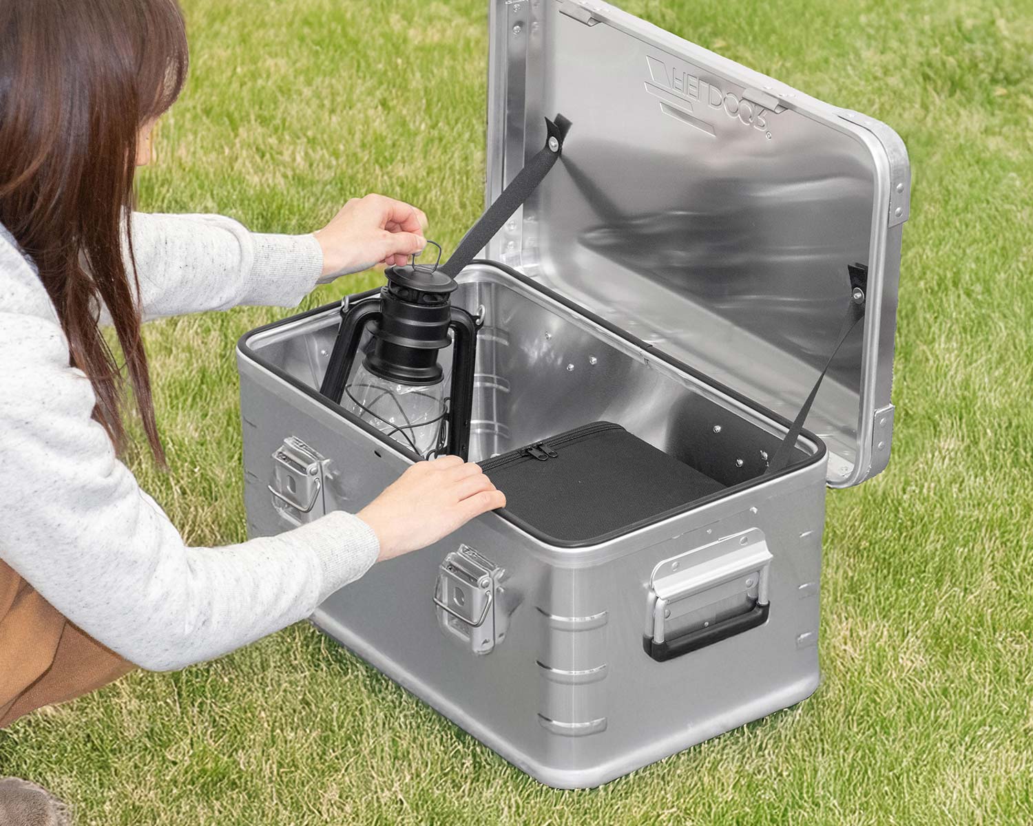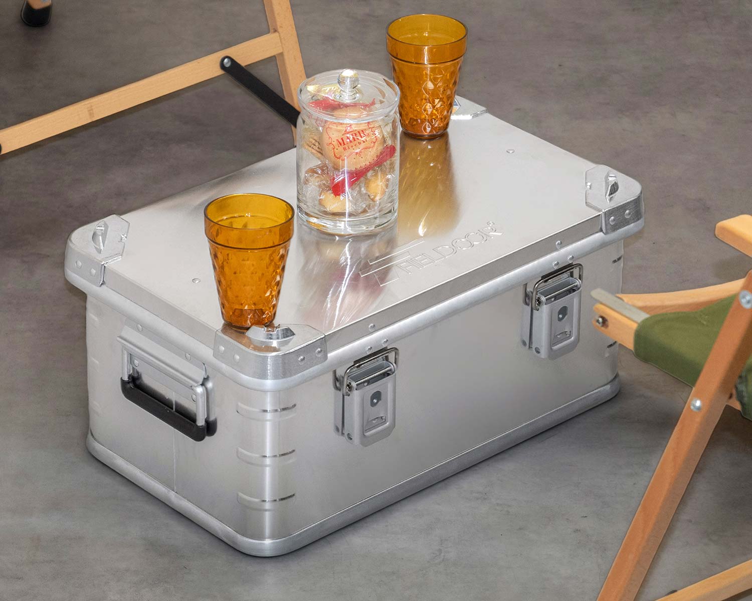 キャンプギアをすっきりまとめることができる、素材感の映えるクラシカルなアルミコンテナボックス。用途で選べるS/M/Lサイズがラインナップ。