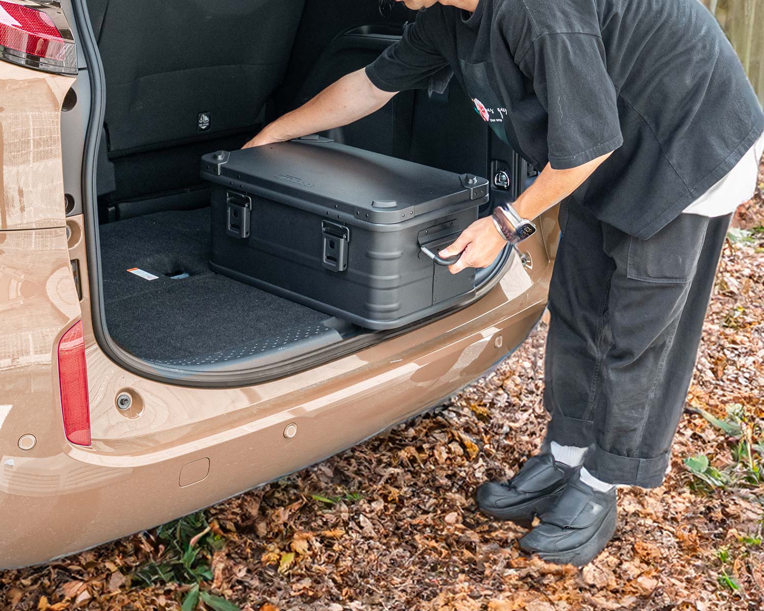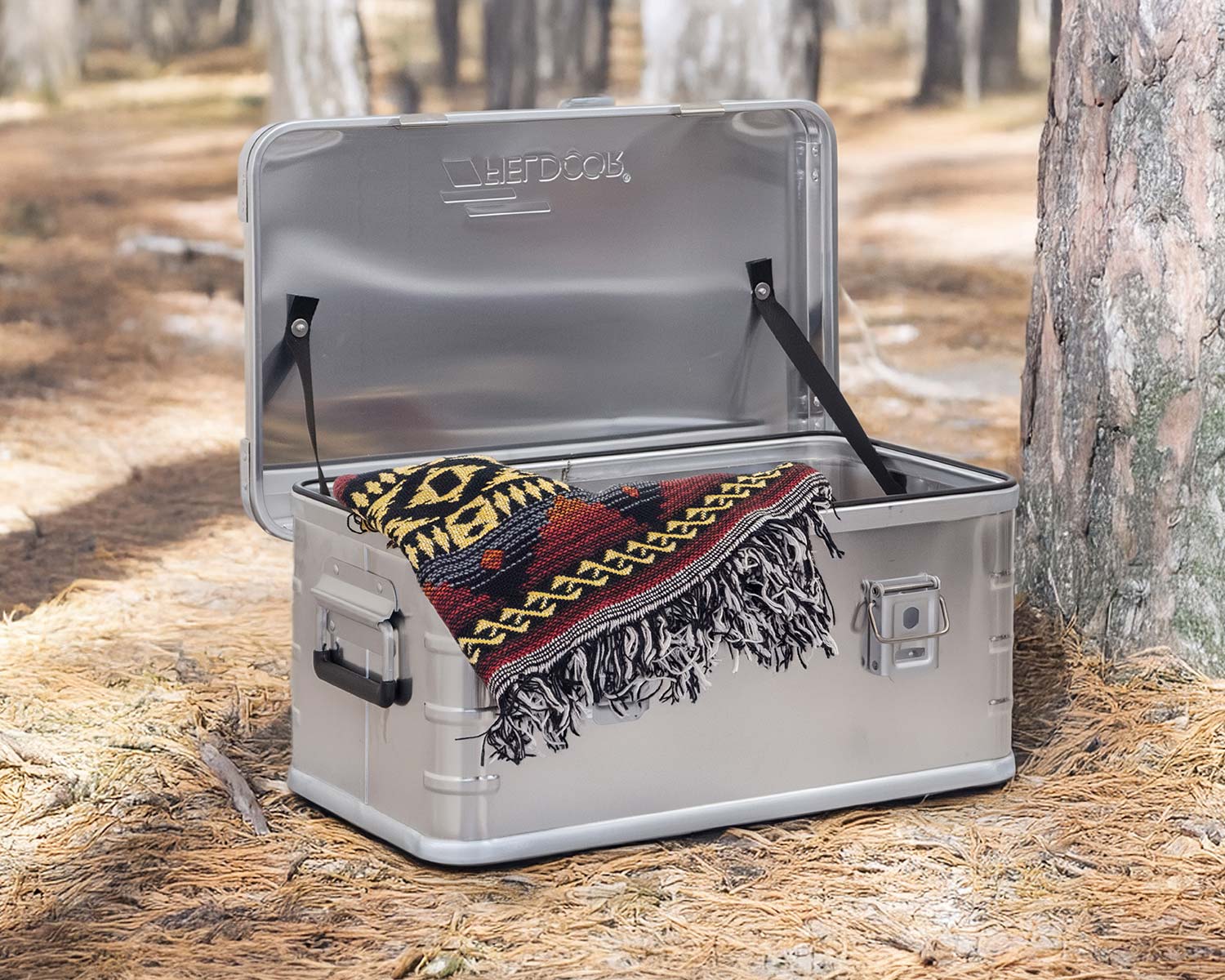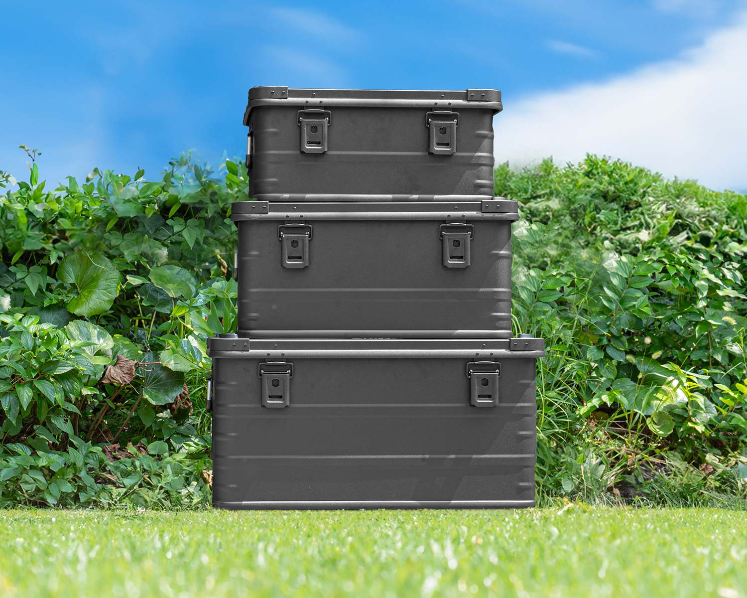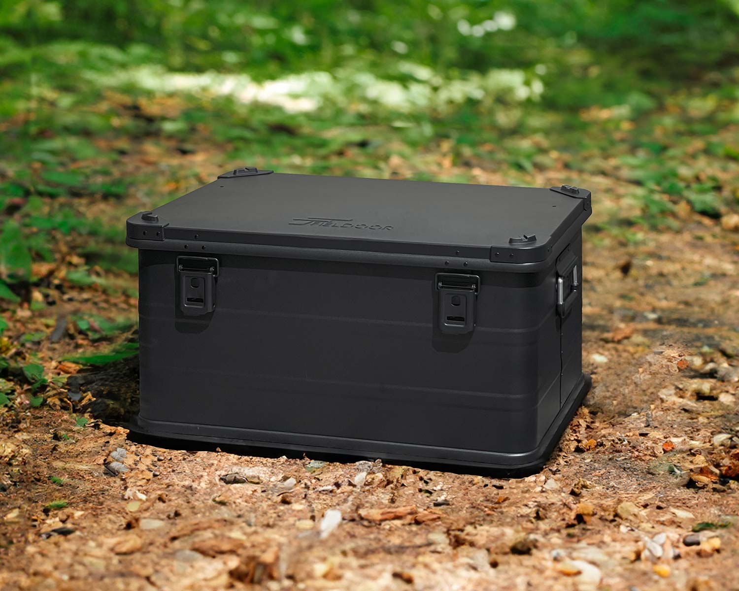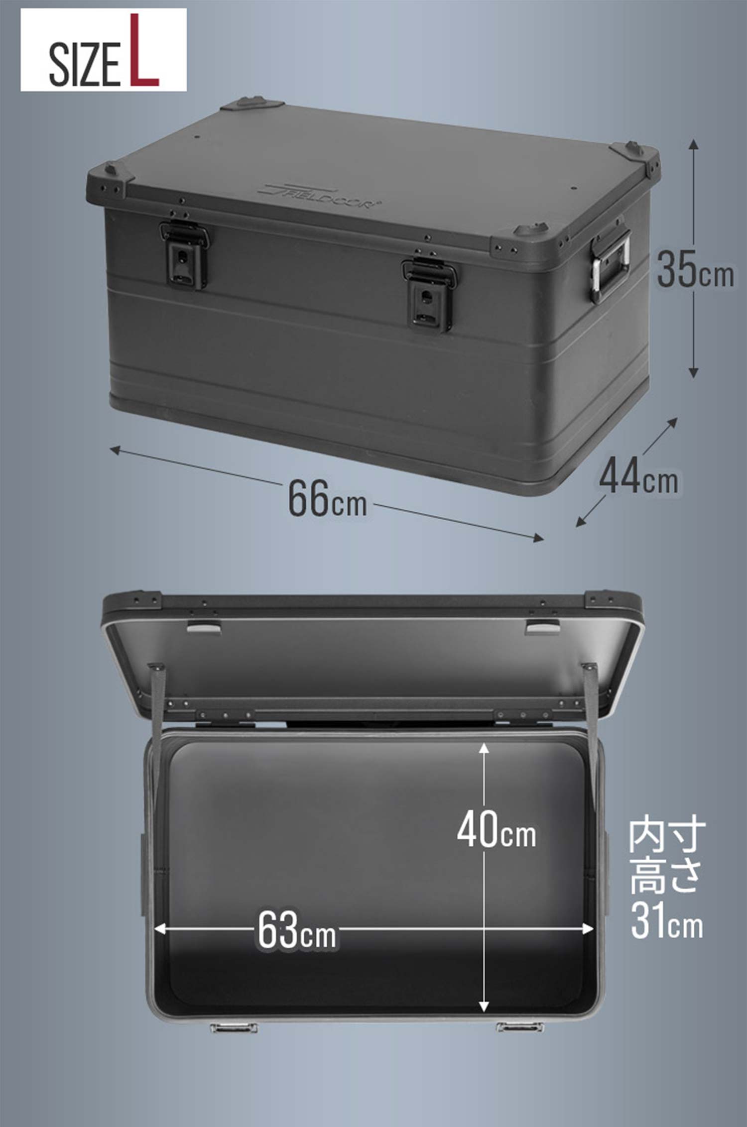 キャンプギアをすっきりまとめることができる、素材感の映えるクラシカルなアルミコンテナボックス。用途で選べるS/M/Lサイズがラインナップ。