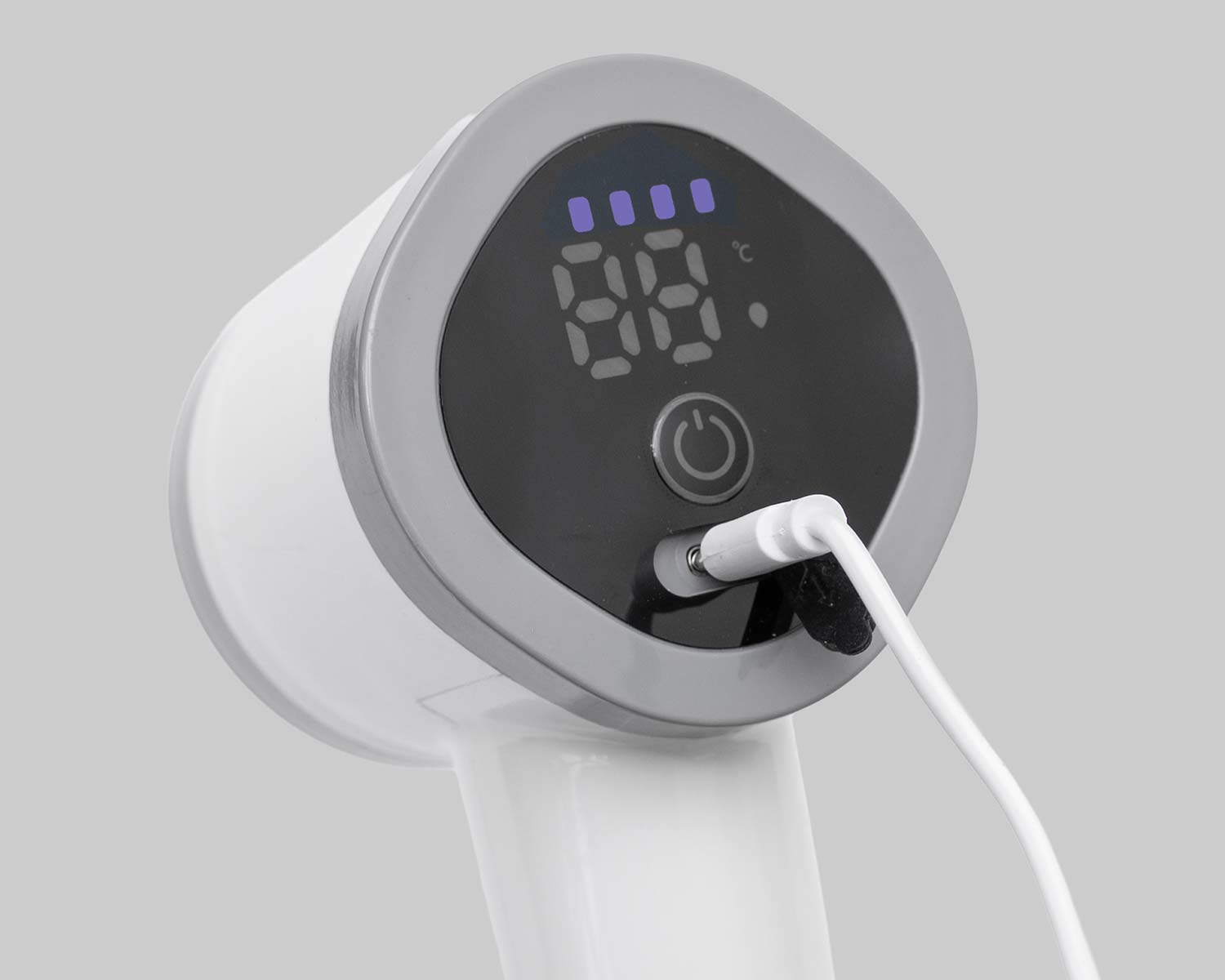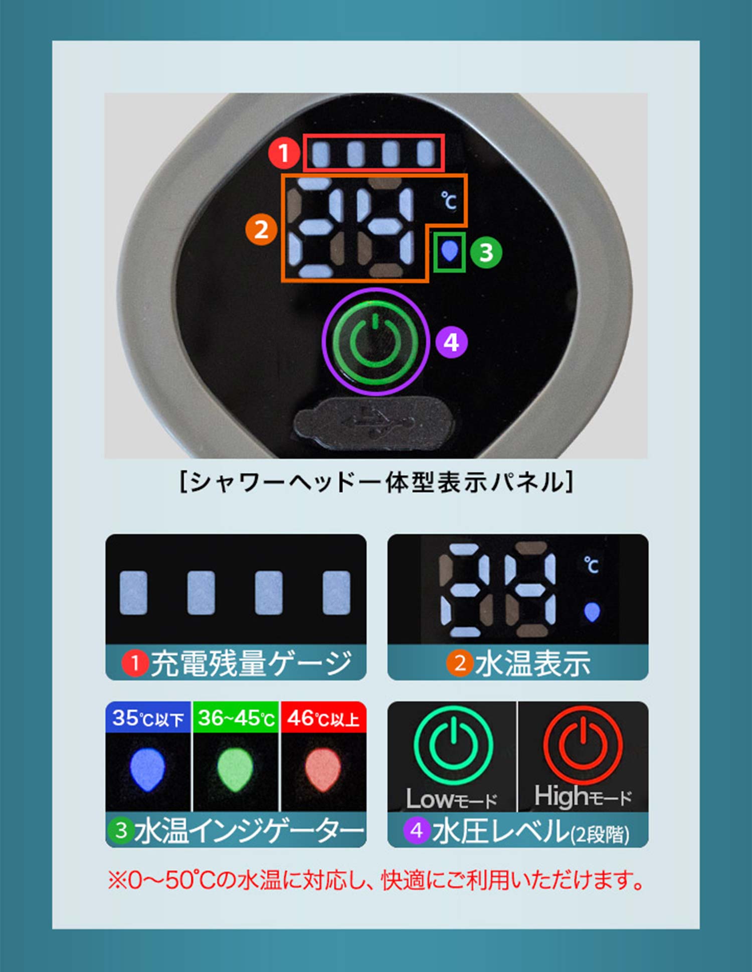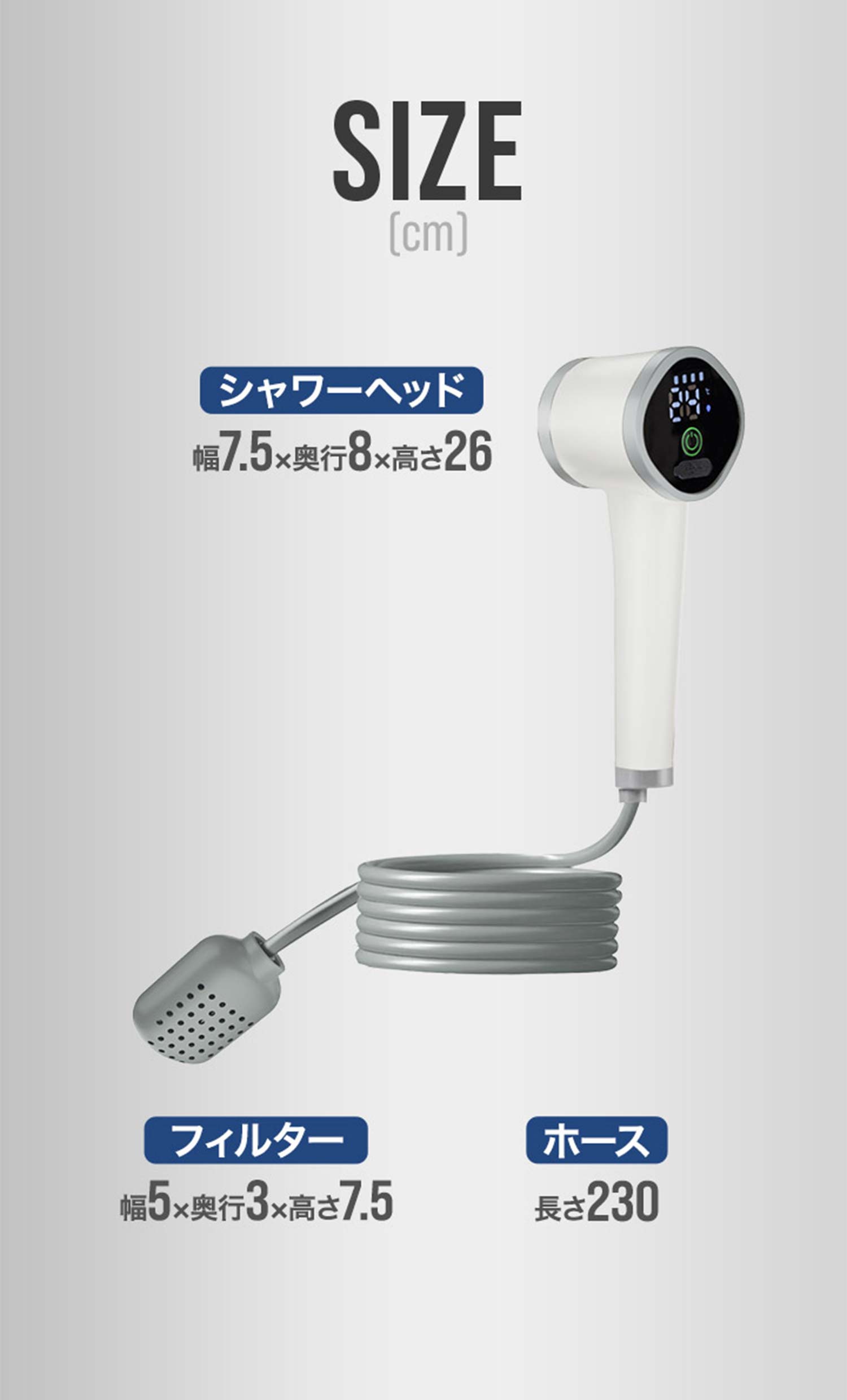 ヘッド本体にはディスプレイを搭載しており、使用中の充電残量、水温、水圧レベルが一目でわかります。充電残量がわかるので、シャワーの途中で突然使えなくなる心配がありません。