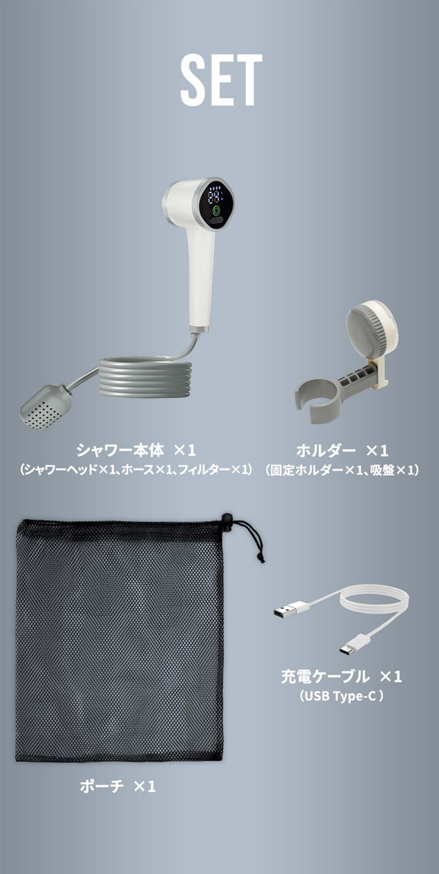 充電式・軽量で持ち運びも簡単。タンクから直接給水できるフィルターと、手元で操作可能な一体型ヘッドを備えた次世代のシャワーです。