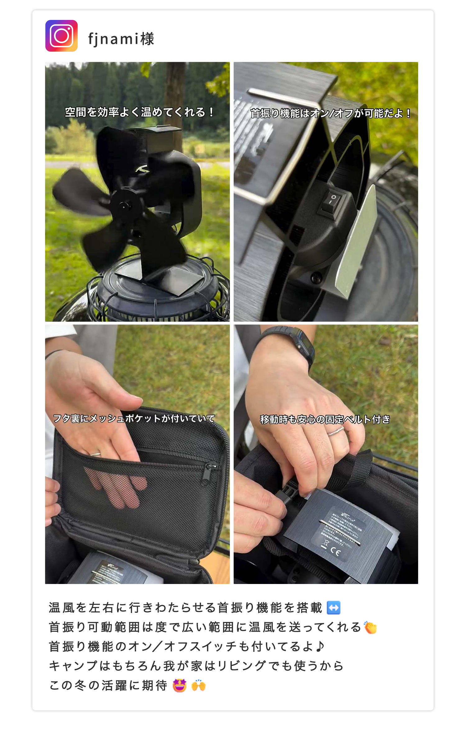ストーブファンは電源を必要としない為、アウトドアでも大活躍。また、置くだけで使用できるので、お家でのストーブの使用にもおすすめ。