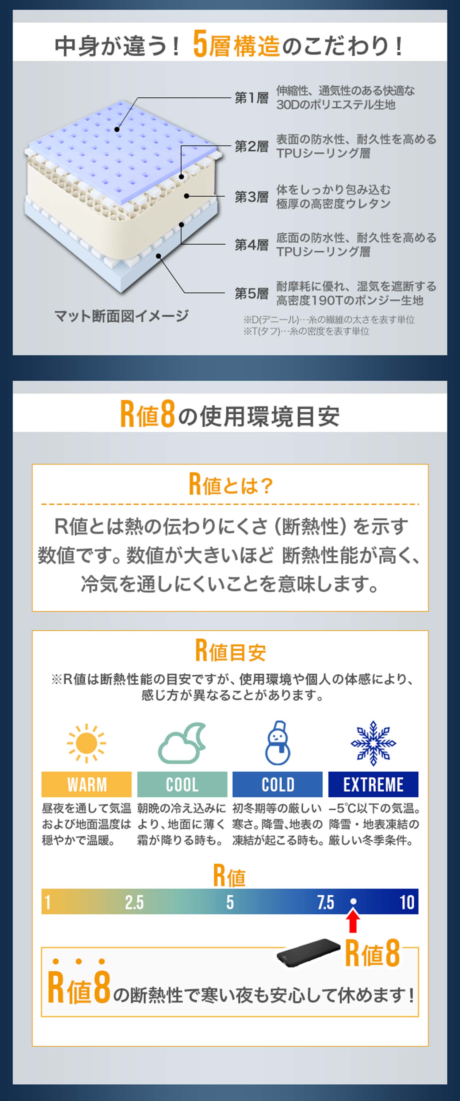伸縮性・通気性のある表地、耐水性に優れた裏地、TPU層で包んだ高密度ウレタンによる5層構造で、R値8の高断熱性を備え、冬のアウトドアでも快適に過ごすことができます。