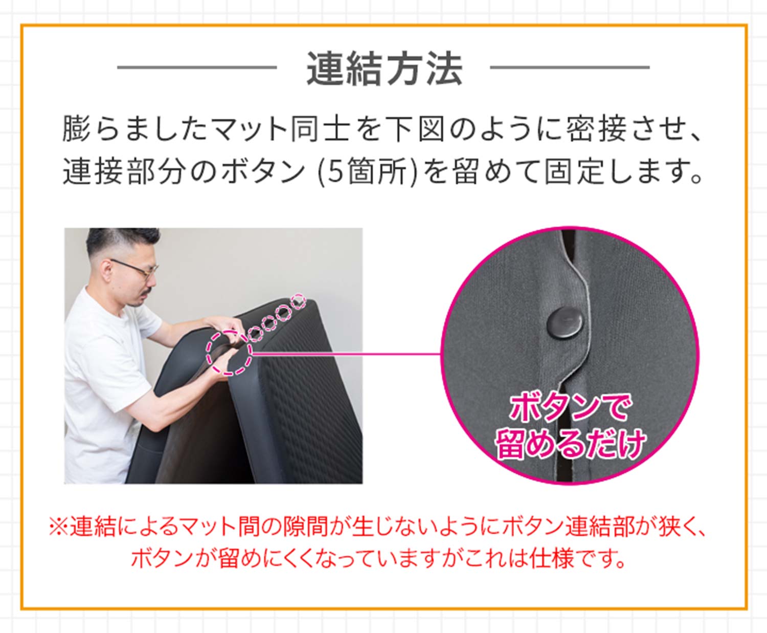 隅々までウレタンが詰まったボックスタイプ。ボタンで簡単に連結できるため、並べても隙間なく快適に使えます。