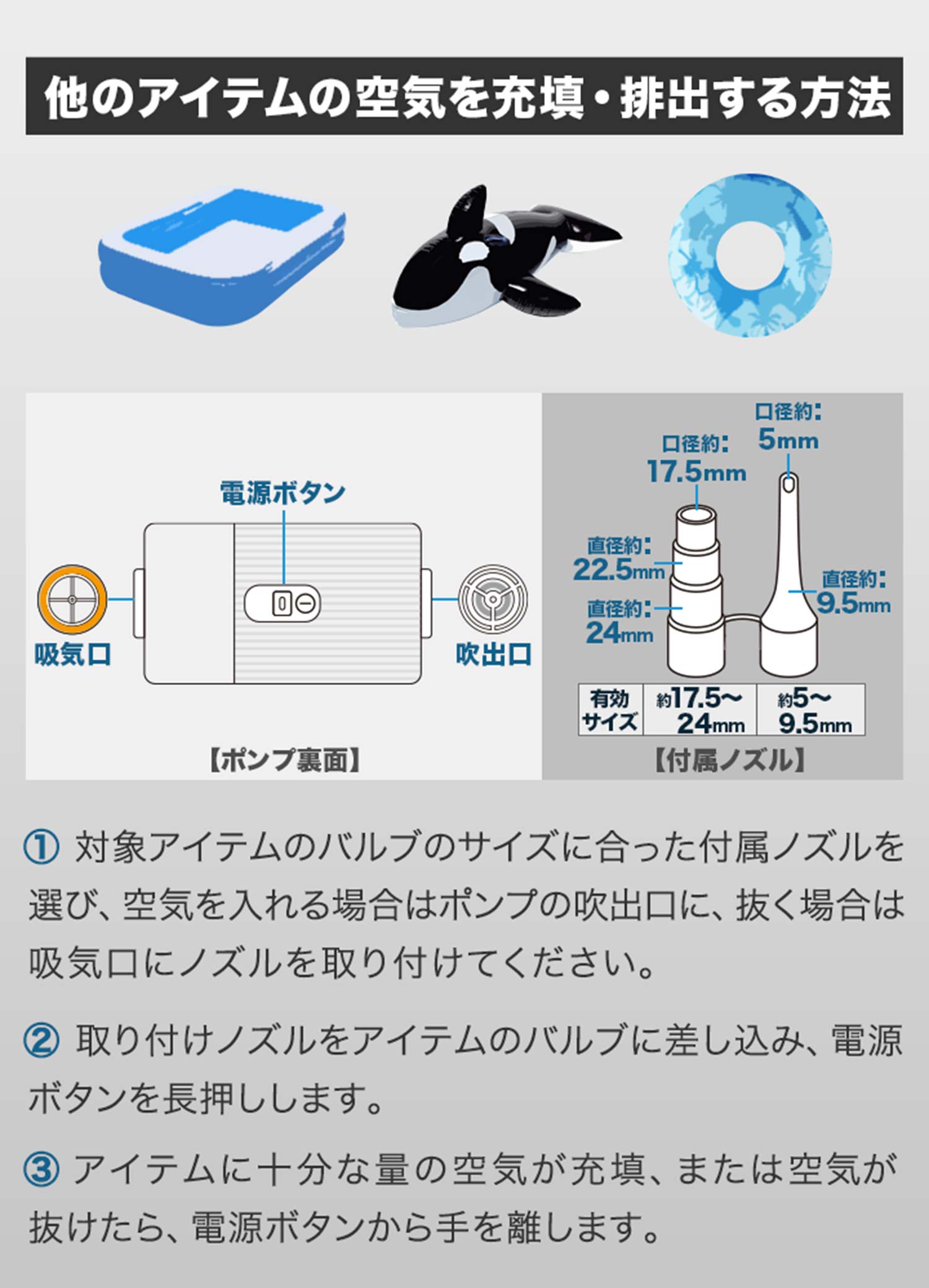 ※ノズルはバルブの大きさに合わせてお使いください。