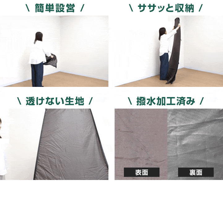 生地は両面とも撥水加工済みなので、急な雨よけとしてはもちろん、簡易シャワー室としても活躍します。