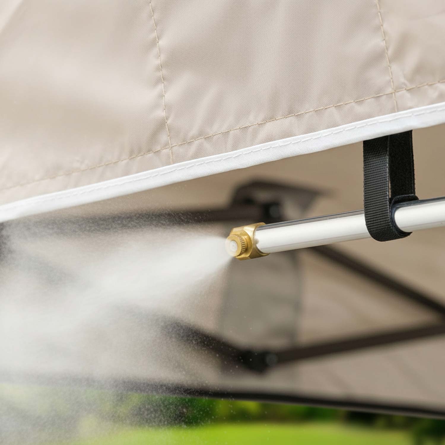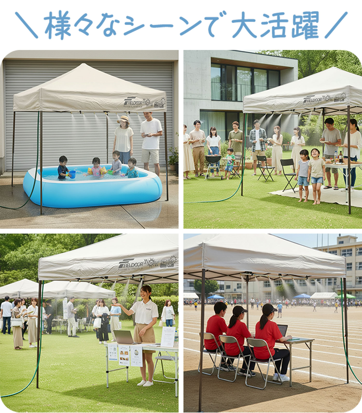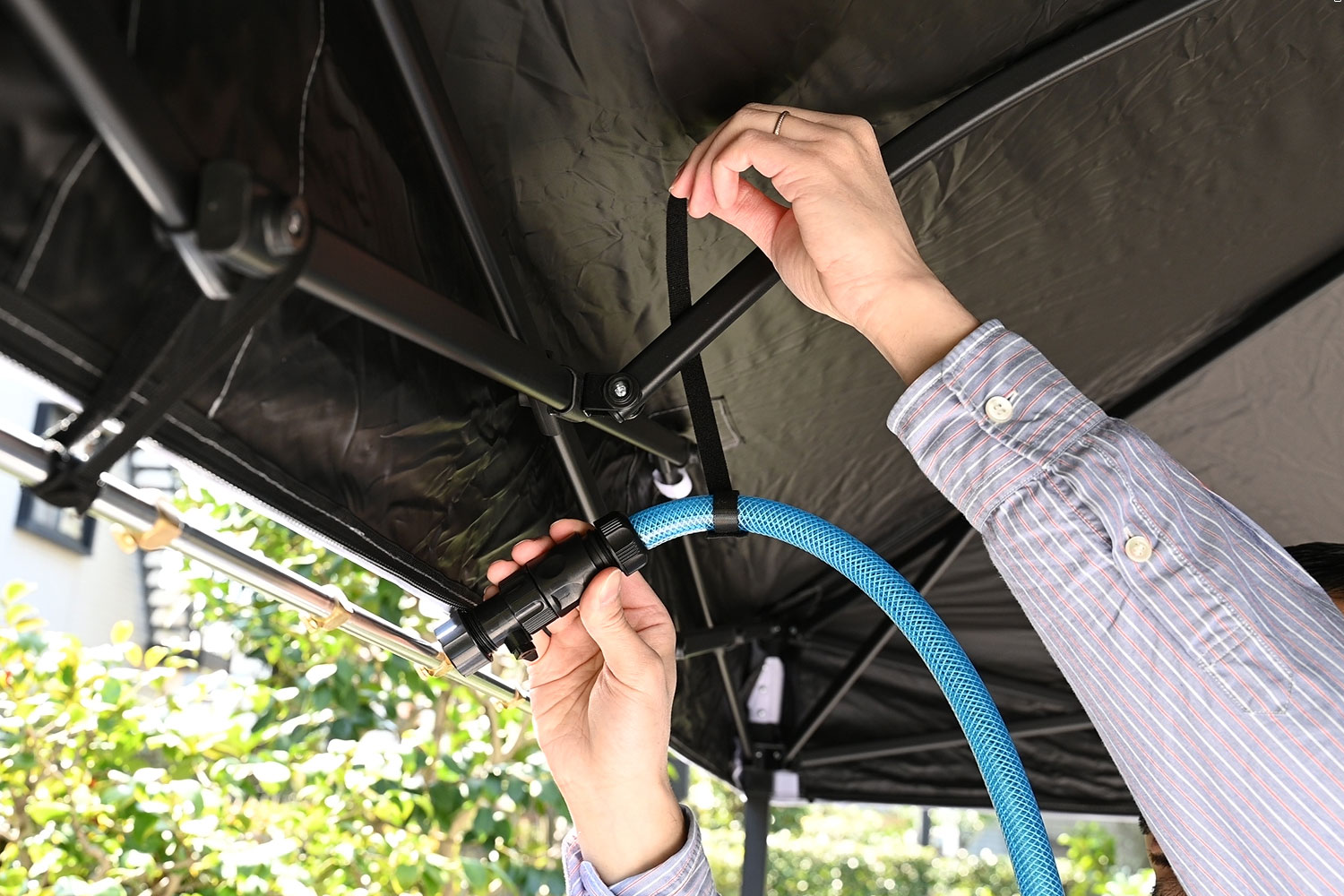 付属の固定バンドでタープテントに取り付け、家庭用ホースに接続するだけで準備オーケー。